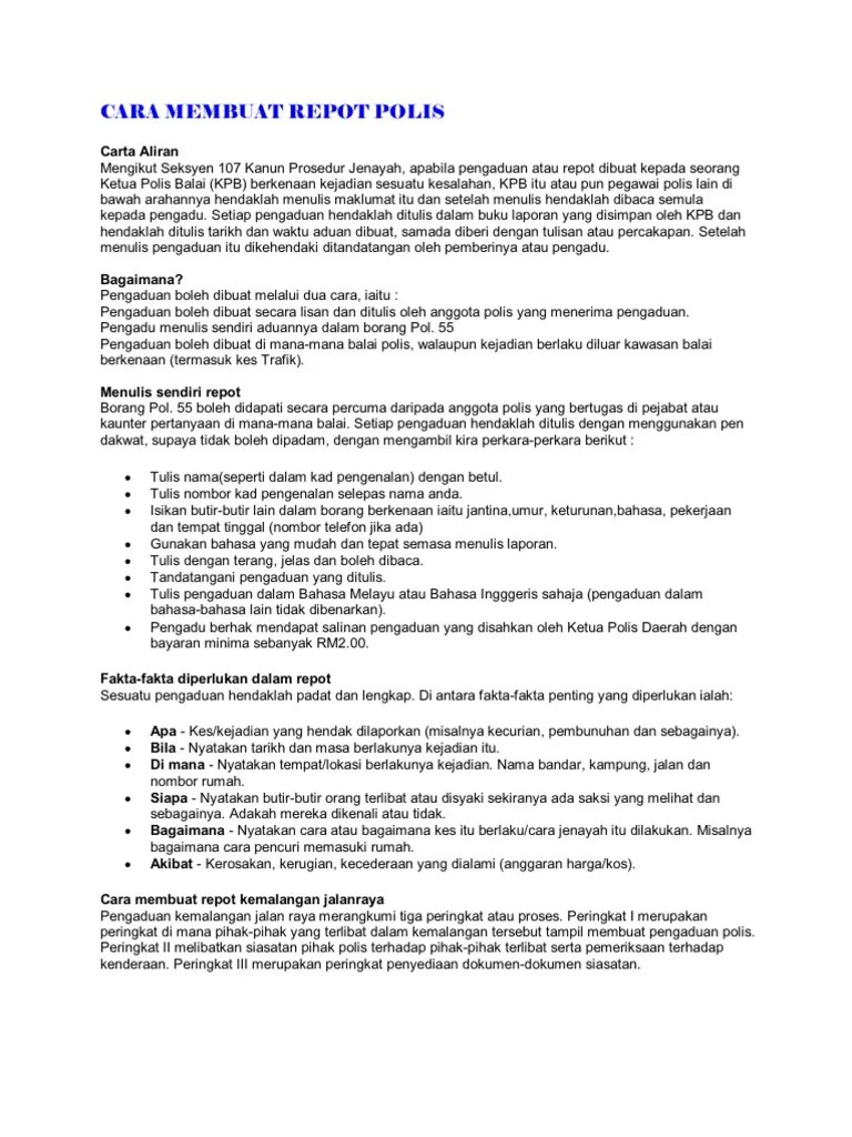 Ketua polis balai (kpb) berkenaan kejadian sesuatu kesalahan, kpb itu atau pun pegawai polis. Bagaimana format surat pengaduan ke polisi berikut ini contohnya. Oleh kerana laporan polis berkaitan kemalangan jalan raya terikat dengan seksyen 114 (g) akta keterangan 1950 terutamanya dalam pembuktian . Ini bertujuan siasatan yang telus dapat dijalankan sejurus selepas menerima laporan bagi menentukan liability kesalahan kemalangan tersebut dan memudahkan . Cik wani menghadapi masalah untuk menuntut insurans . (b) memberi laporan secara lisan kepada .